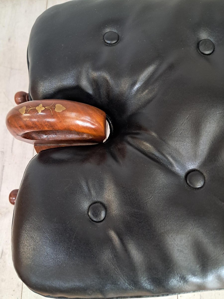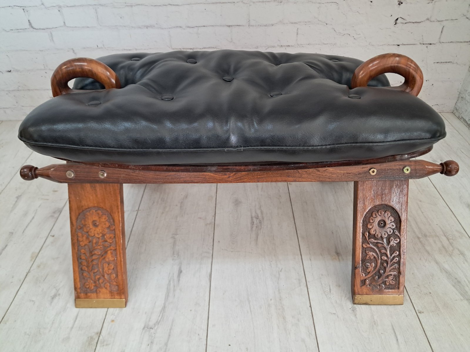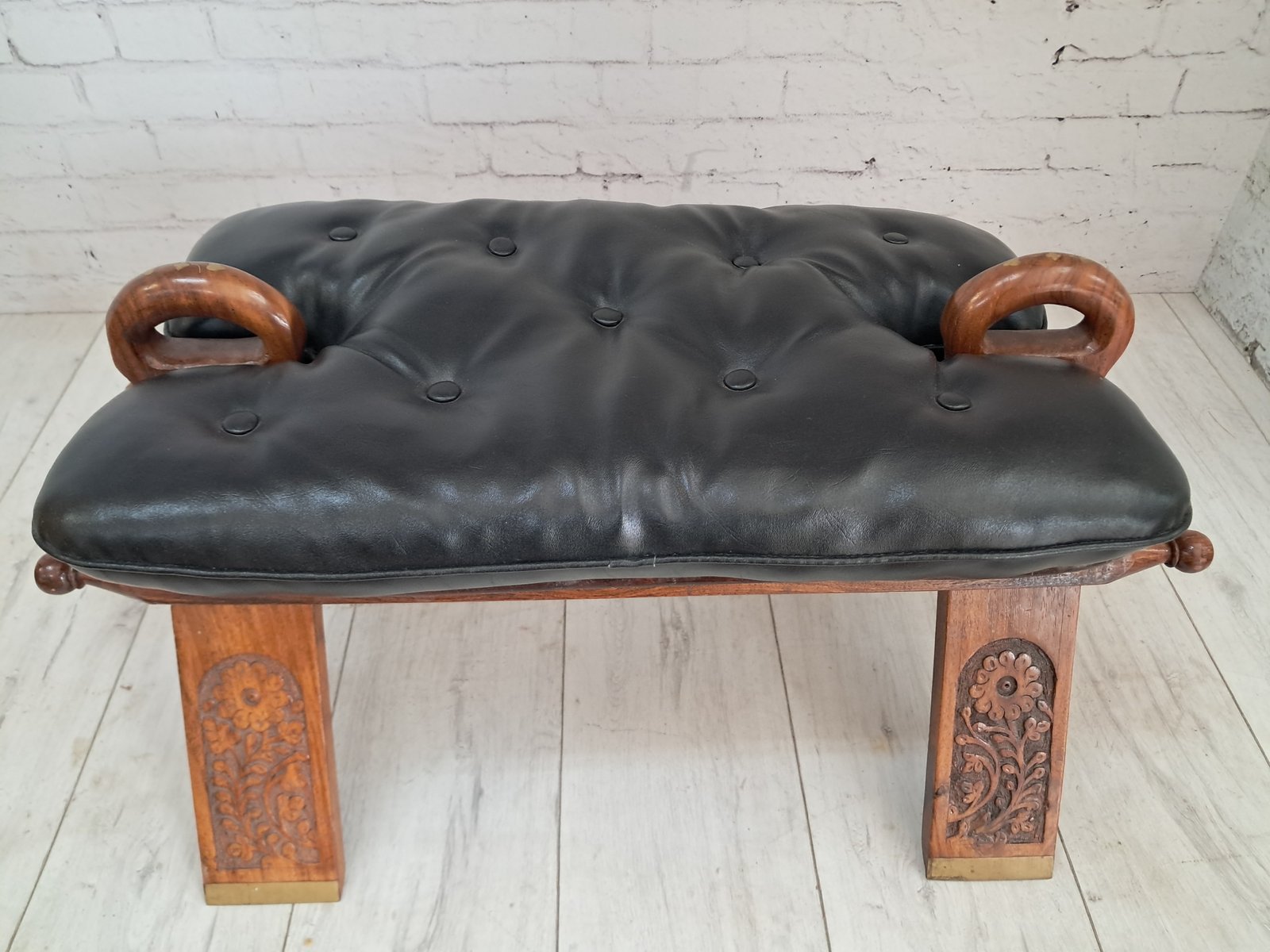 A distinctive and beautifully crafted vintage Camel Stool from the 1970s, featuring an intricately carved solid oak frame with floral detailing on the legs and elegant brass-capped feet. The seat is upholstered in smooth black buttoned leatherette, adding both comfort and sophistication to this decorative piece. This piece is in superb vintage condition.