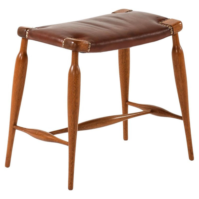 This rare stool, model 967, was designed by Josef Frank and produced by Svenskt Tenn in Sweden during the 1950s. It exemplifies Scandinavian modern craftsmanship through its elegant and balanced proportions. The frame is made from solid mahogany, featuring finely turned legs and distinctive crossbars that provide both structural stability and visual refinement. The seat has been newly reupholstered in red-brown leather, carefully secured with brass rivets at each corner. This detail not only ensures durability but also enhances the artisanal quality of the piece. The stool remains in very good vintage condition, with minor signs of wear mainly on the wooden frame. The light patina and small marks add to its authenticity and historical character, while the fresh leather upholstery shows minimal wear.