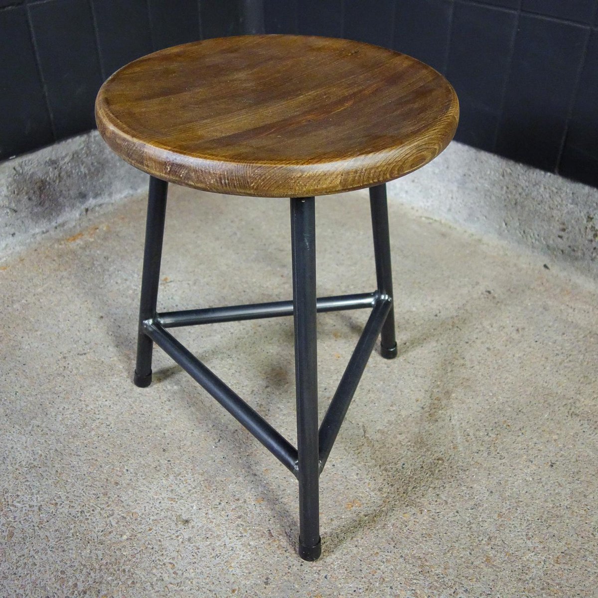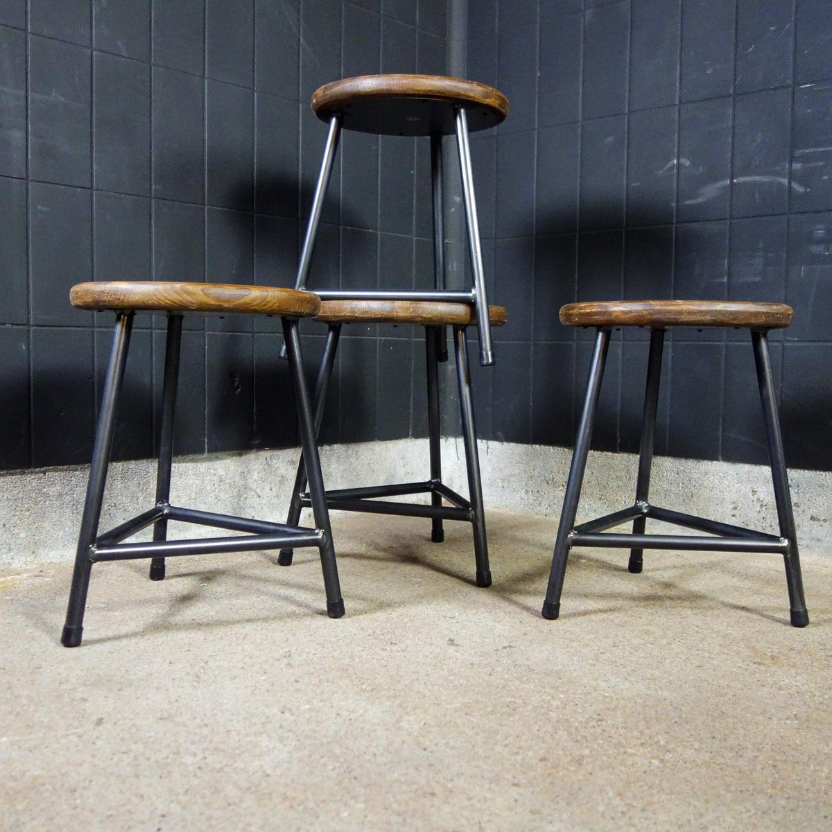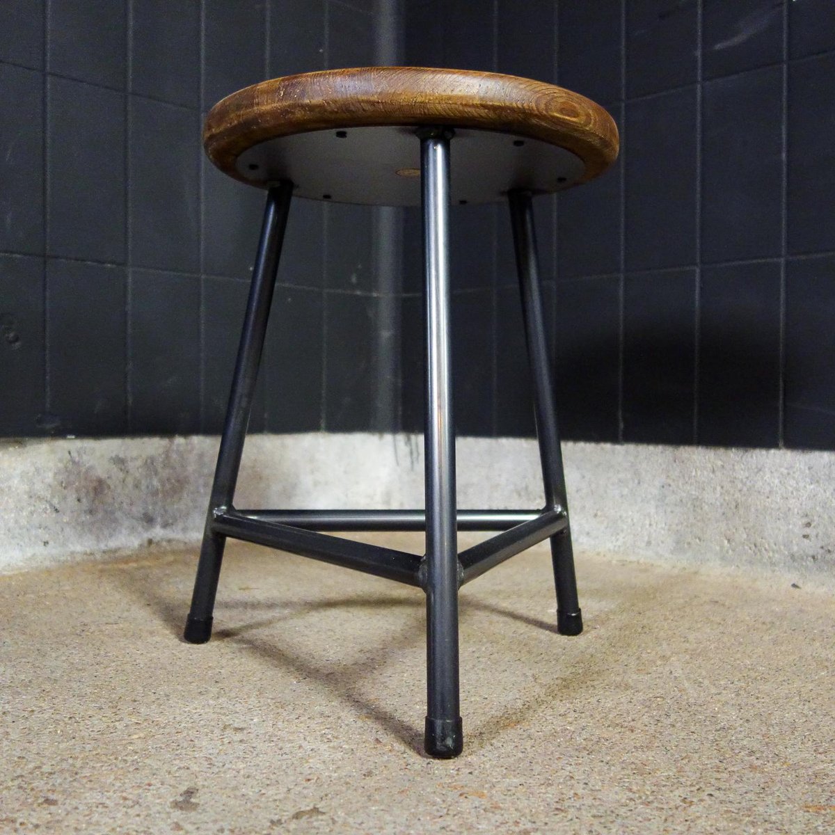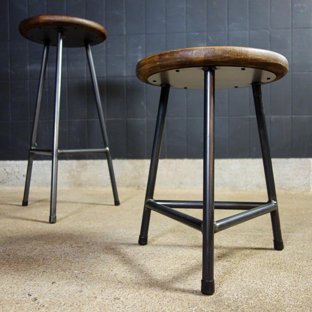 Our popular industrial crutches are made and finished by hand. The steel 3-leg frame provides a stable seat, the bottom of the seat is also equipped with a round steel plate, which gives extra strength to the wooden seat. The steel is equipped with a white varnish, the seat is painted twice for protection. The dark steel together with the brown wooden seat ensure a sturdy look. The wooden seat is turned by hand. If you look closely at the photos, you will see that they have a light "Holling", which ensures extra seating comfort! The crutches are stackable. Dimensions: 47hx35d