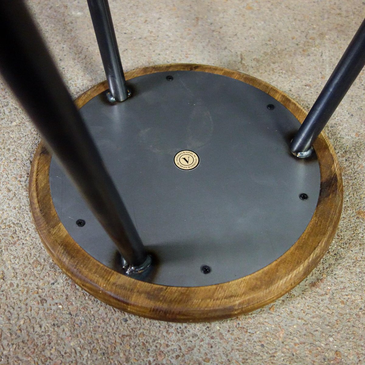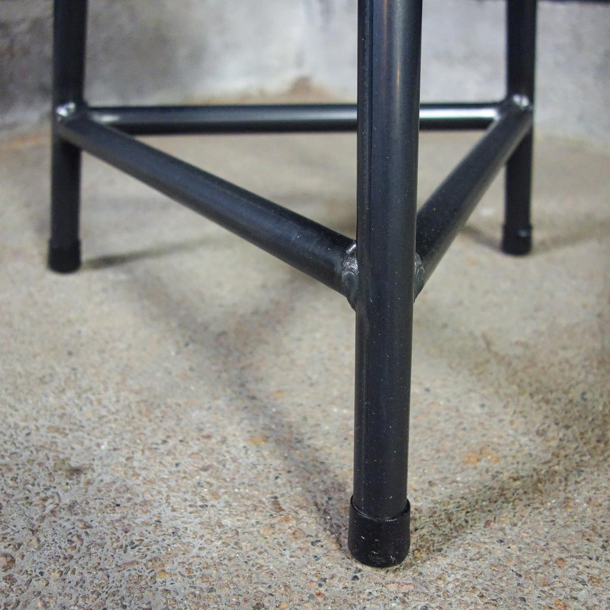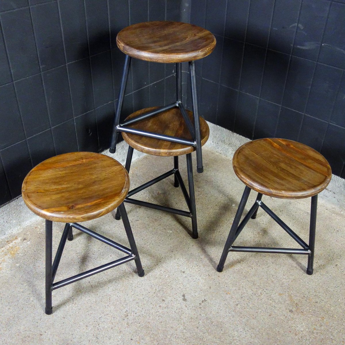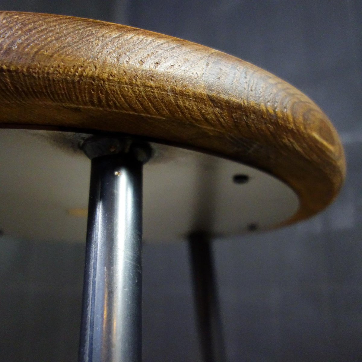 Our popular industrial crutches are made and finished by hand. The steel 3-leg frame provides a stable seat, the bottom of the seat is also equipped with a round steel plate, which gives extra strength to the wooden seat. The steel is equipped with a white varnish, the seat is painted twice for protection. The dark steel together with the brown wooden seat ensure a sturdy look. The wooden seat is turned by hand. If you look closely at the photos, you will see that they have a light "Holling", which ensures extra seating comfort! The crutches are stackable. Dimensions: 47hx35d
