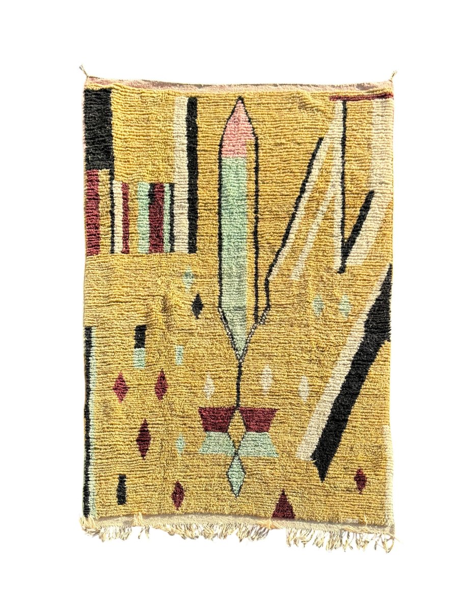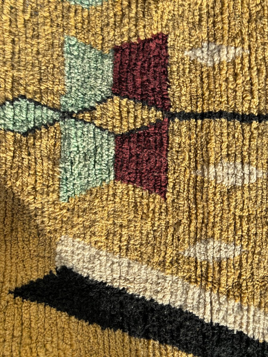 Le fond moutarde chaud associé à des éléments géométriques contrastés confère au tapis une forte identité visuelle, ce qui le rend idéal pour les intérieurs modernes, éclectiques, bohèmes et axés sur le design. Son épais velours de laine assure à la fois confort et durabilité, tandis que la nature artisanale du tapis garantit que chaque pièce reste unique.