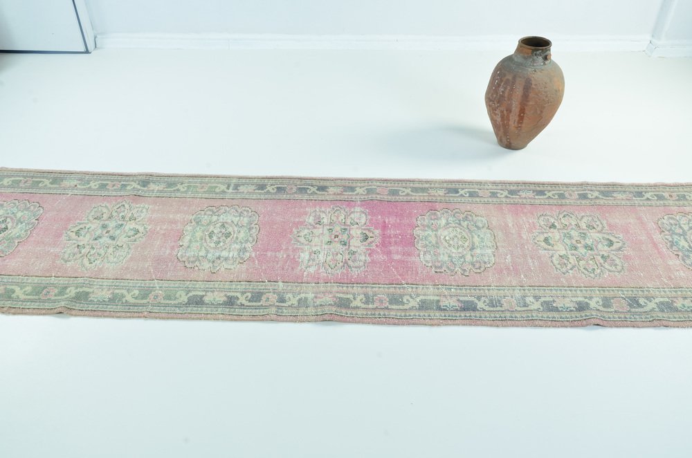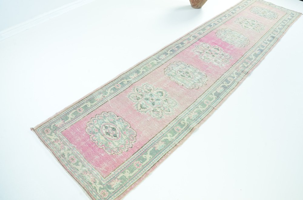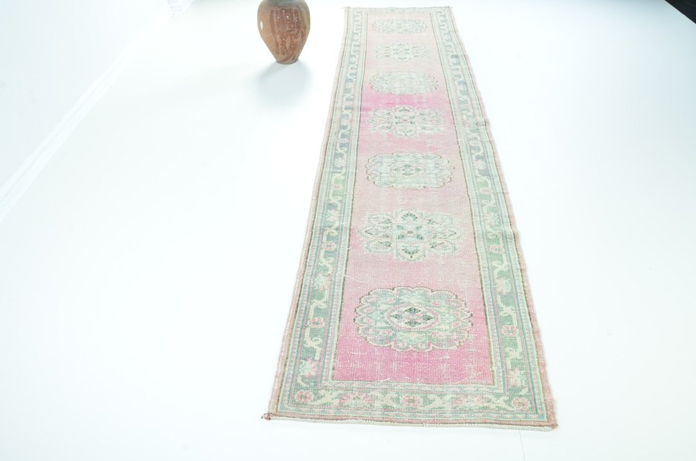 Tapis de passage long en laine rose pâle et vert