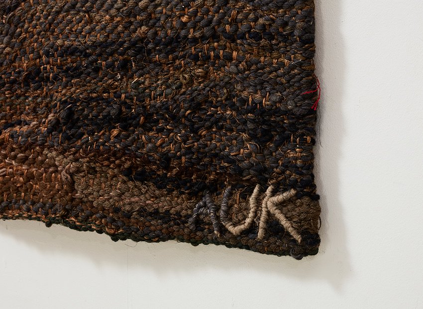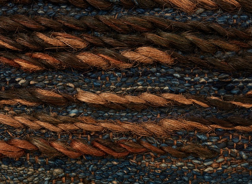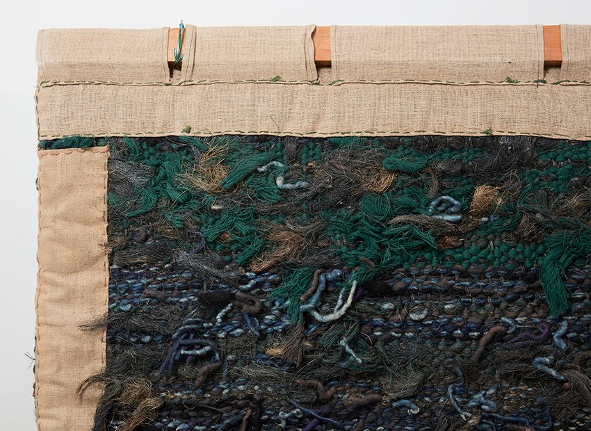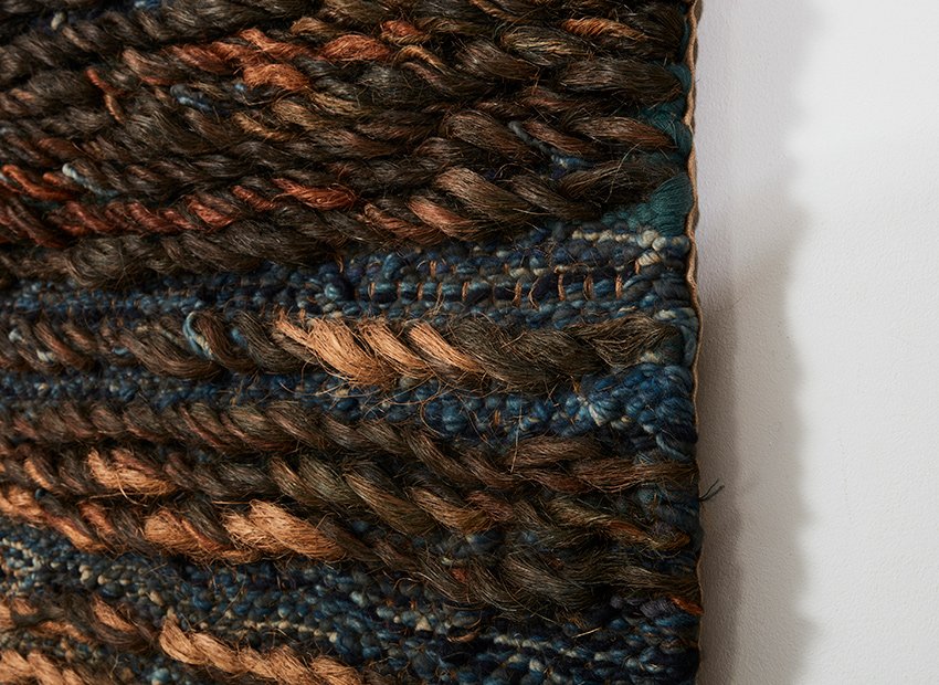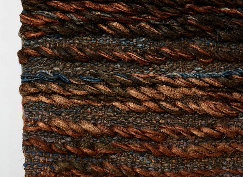 She used different weaving techniques nicely blending in eachother. The evening glow of the sun reflecting on the water in an abstract way. The earthy colours (brown, beige, cream, blue and green) gives it a serene appearance.