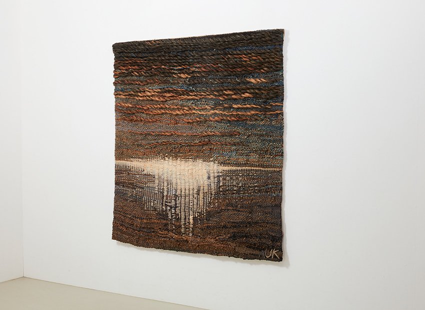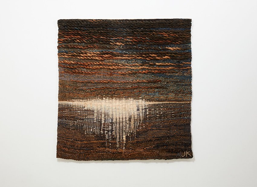 Elle a utilisé différentes techniques de tissage qui se fondent bien les unes dans les autres. L'éclat du soleil du soir se reflétant sur l'eau de manière abstraite. Les couleurs terreuses (brun, beige, crème, bleu et vert) lui donnent un aspect serein.