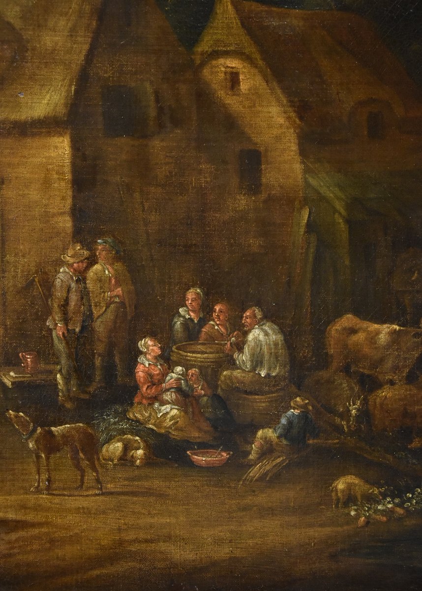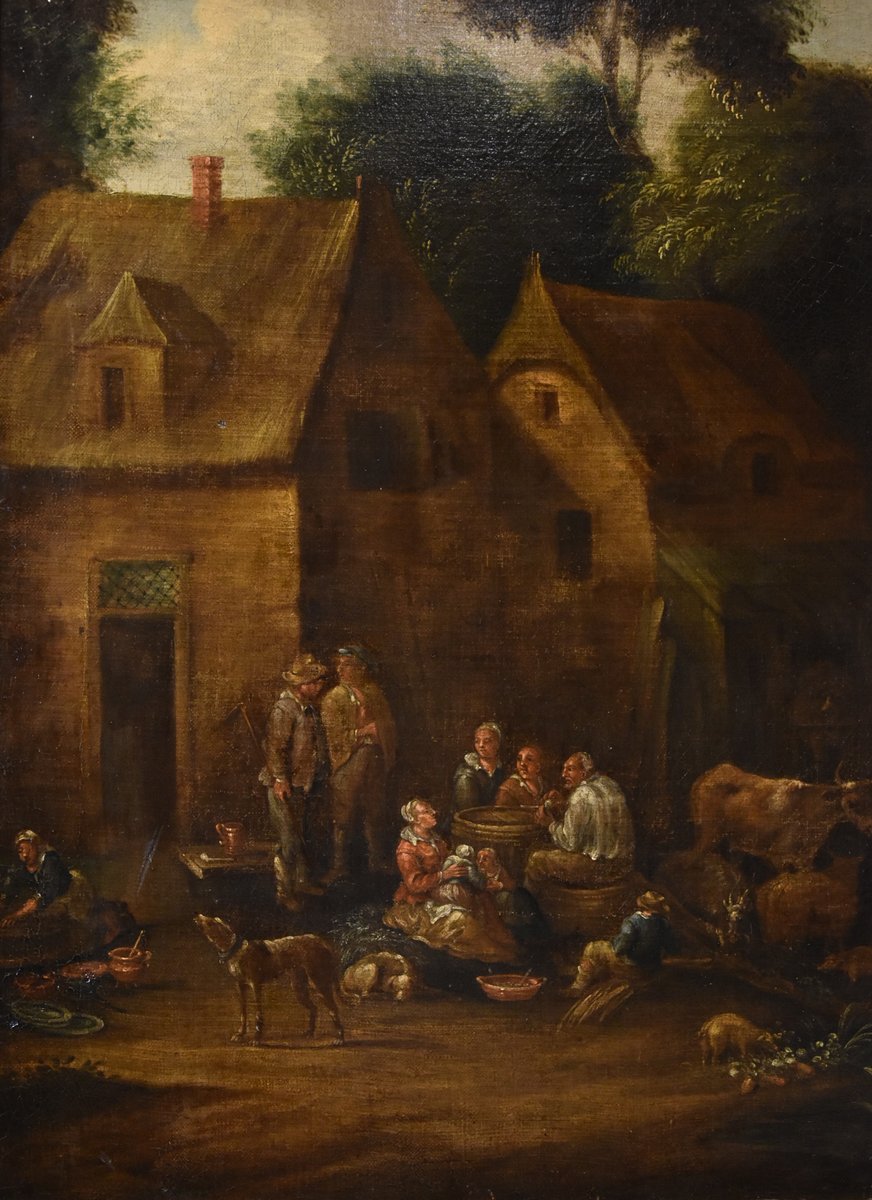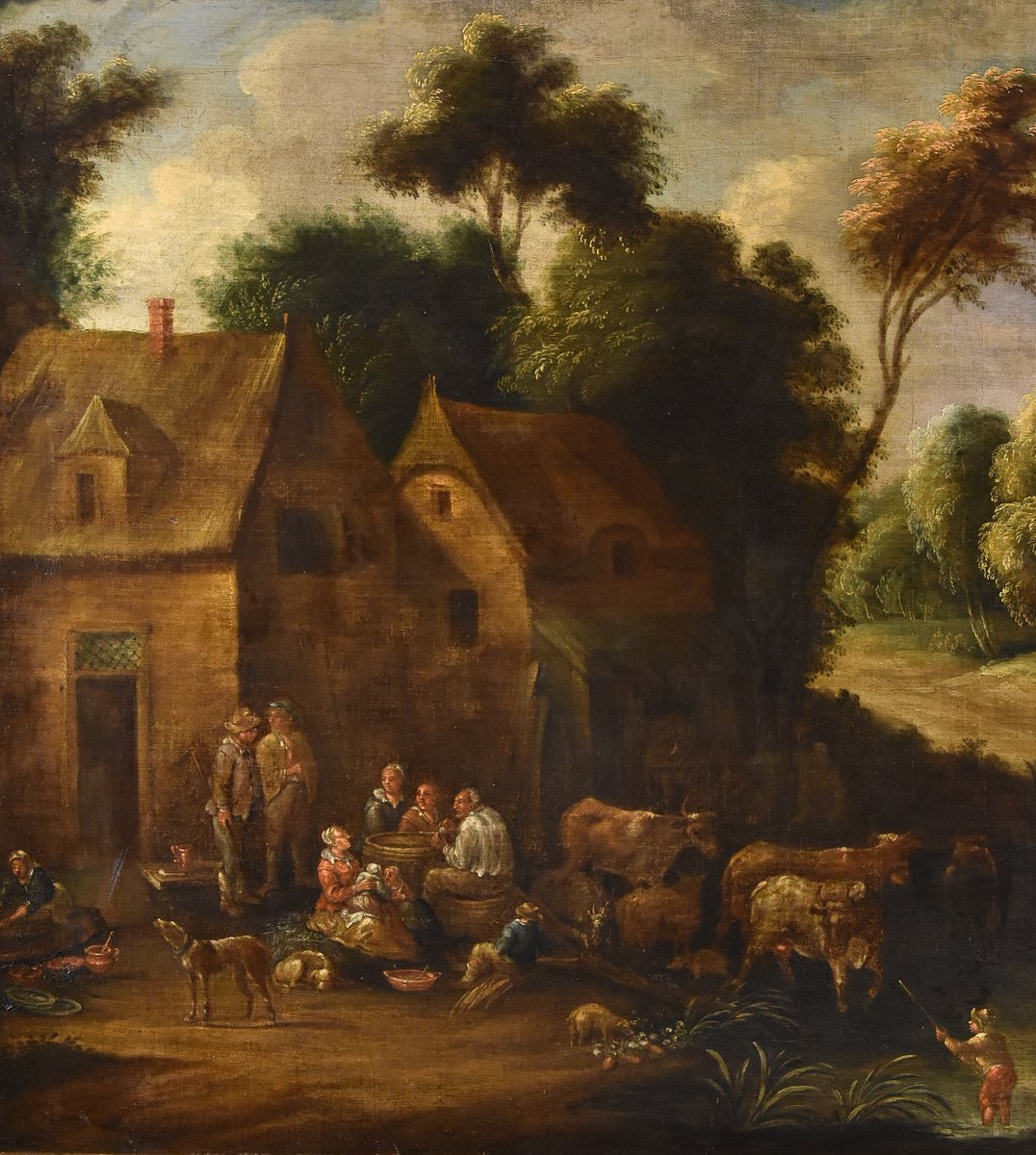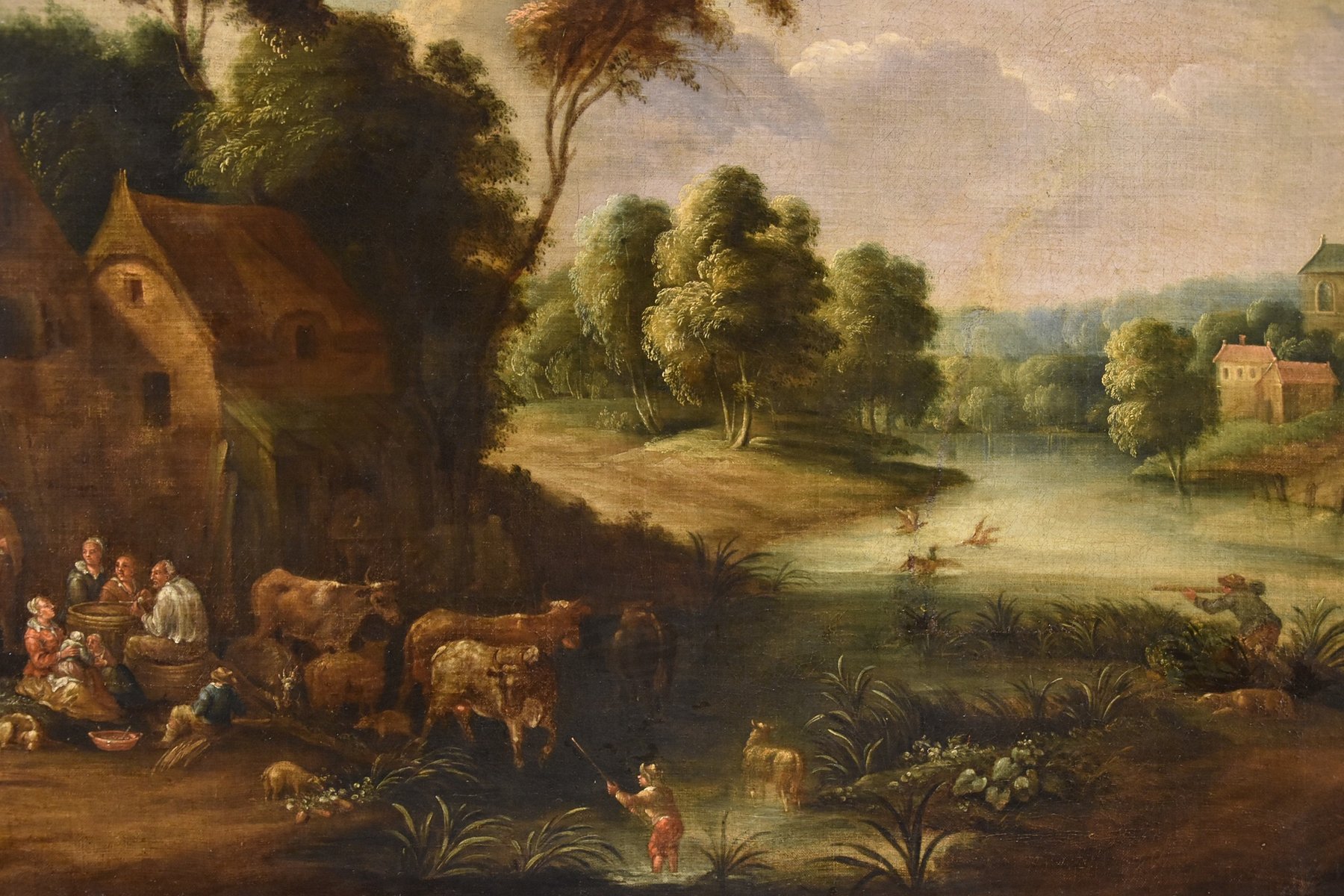 Clearly influenced by the humanistic landscapes of Jan Brueghel the Younger, whose pupil he was, the painter enlivens them with numerous characters from peasant life, all immersed in a soft, golden atmosphere.
