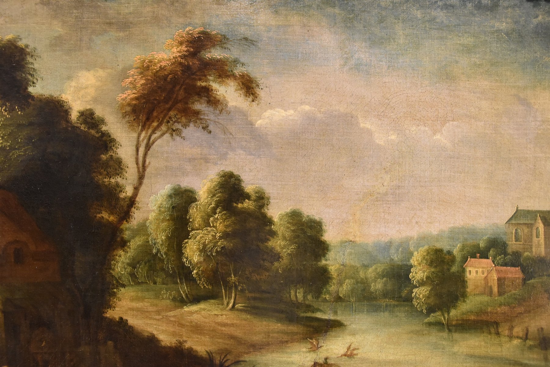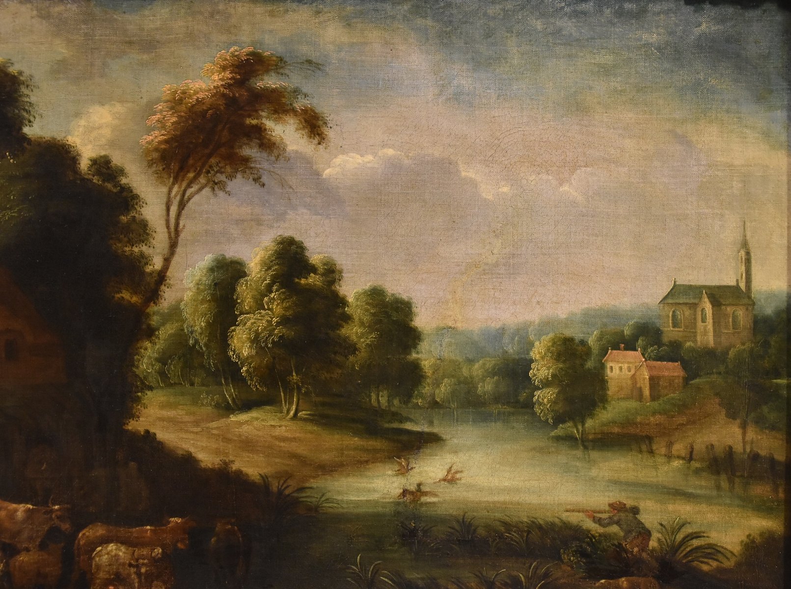 We present this vast and harmonious composition, where a characteristic river landscape serves as the backdrop for an exquisite glimpse of popular life, set in a small village, with the city proper in the distance.