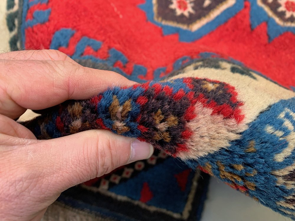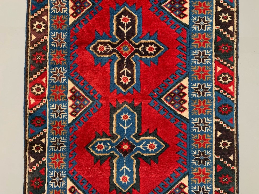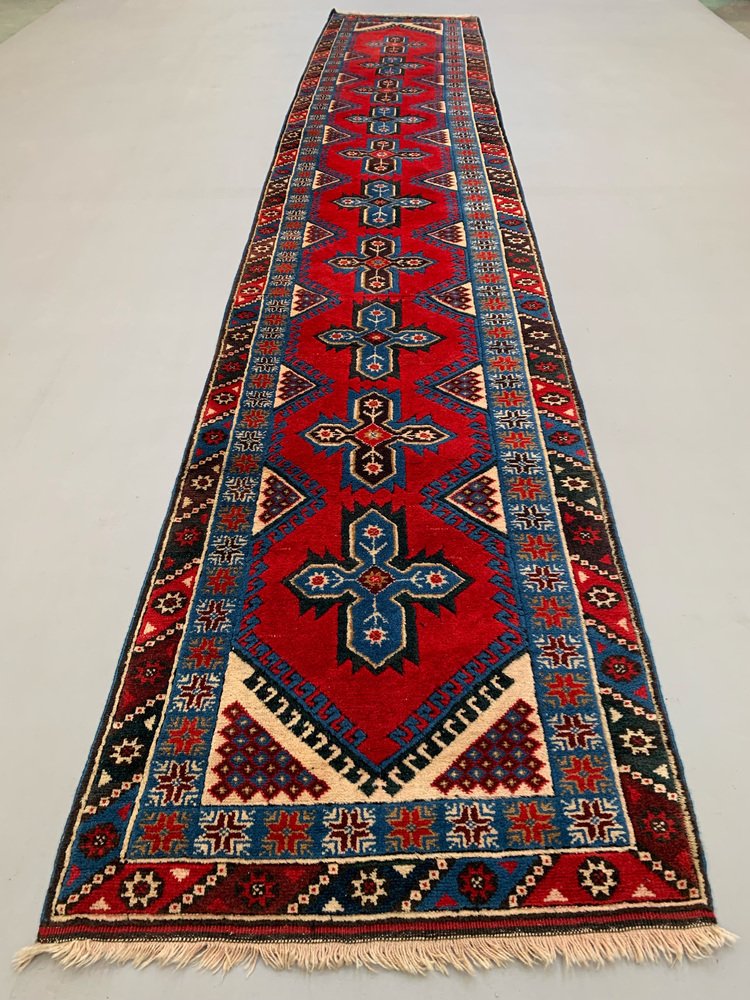 Très Long Tapis de Couloir Turc Rouge, Beige et Bleu