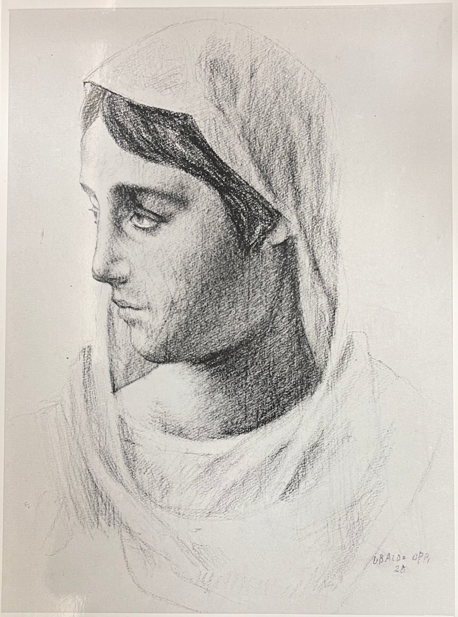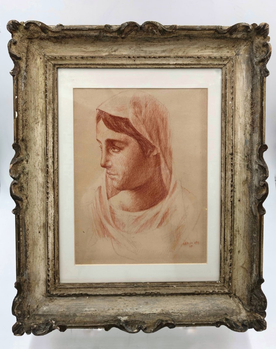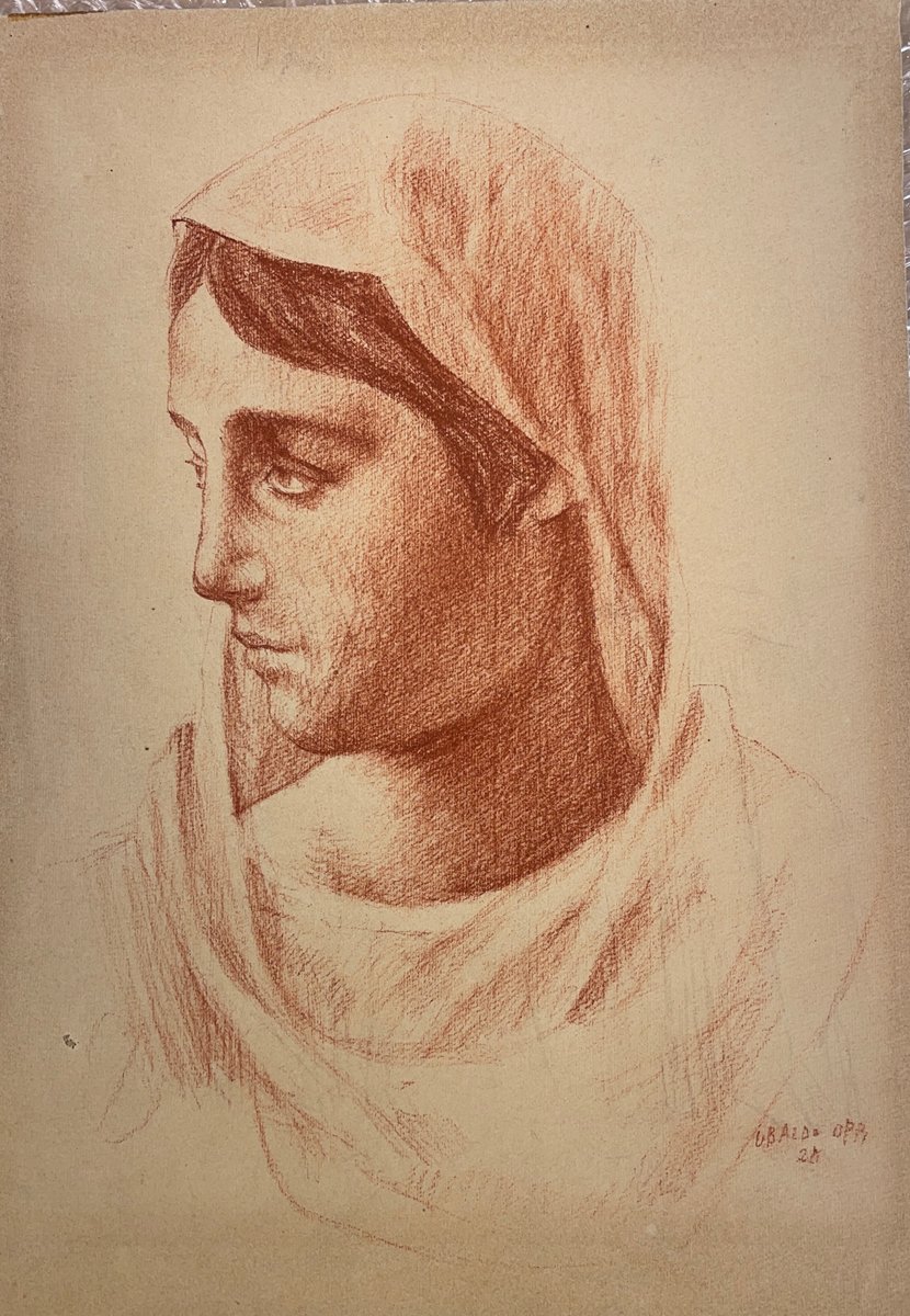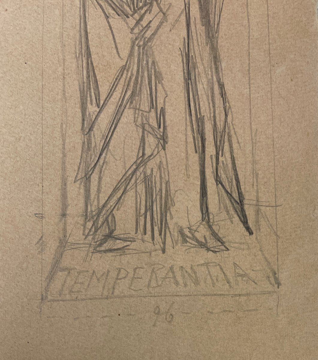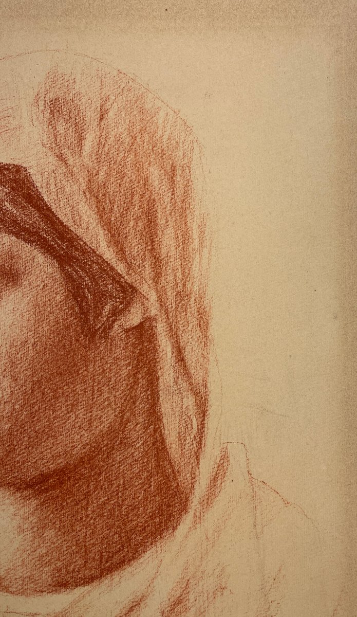 The work in question is a drawing made with sanguine, a technique widely used to create sketches, on paper measuring 35.5x25.5 cm. It is a Face of a Woman and the peculiarity of the work is the back which presents a study, probably of saints or two Madonnas, made in graphite with the writing "PRUDENTIA" and "TEMPERANTIA".