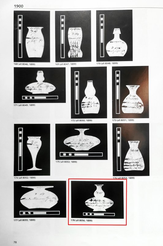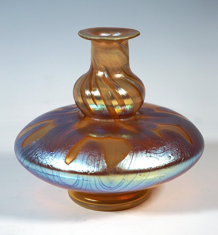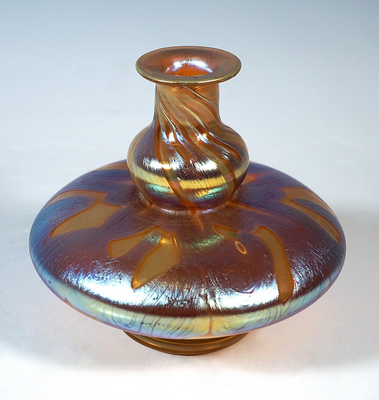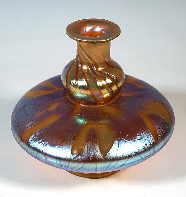 Mould blown, baluster-shaped body with a wide, spinning-top-like belly, attached, spherical neck with flared rim, offset, flush base with ground, polished pontil, matt-cut arrow signature mark (- the symbol taken from the Spaun coat of arms was registered in 1891 as a trademark for glasses from Klostermühle; it was used as a signature on glasses from around 1898). Shape: Series II, Prod. No. - PN 178, year 1900 (old: 8065, year 1899) Decor: Bronze Phenomeneon Genre - PG 29 Colorless glass, bronze-colored overlay, wrapped with blue veined bands in silver-yellow and irregularly warped, leaving out bronze-colored windows. Model-blown and shaped, reduced and iridescent, in silver-yellow bluish on the outer wall, inside of the mouth opening in silver-yellow. Manufactured by Loetz Widow / Klostermühle / Bohemia / Austria-Hungary Dating of manufacture: around 1900 Dimensions: Height: 12,3 cm / 4.84 in Diameter: 13,5 cm / 5.31 in