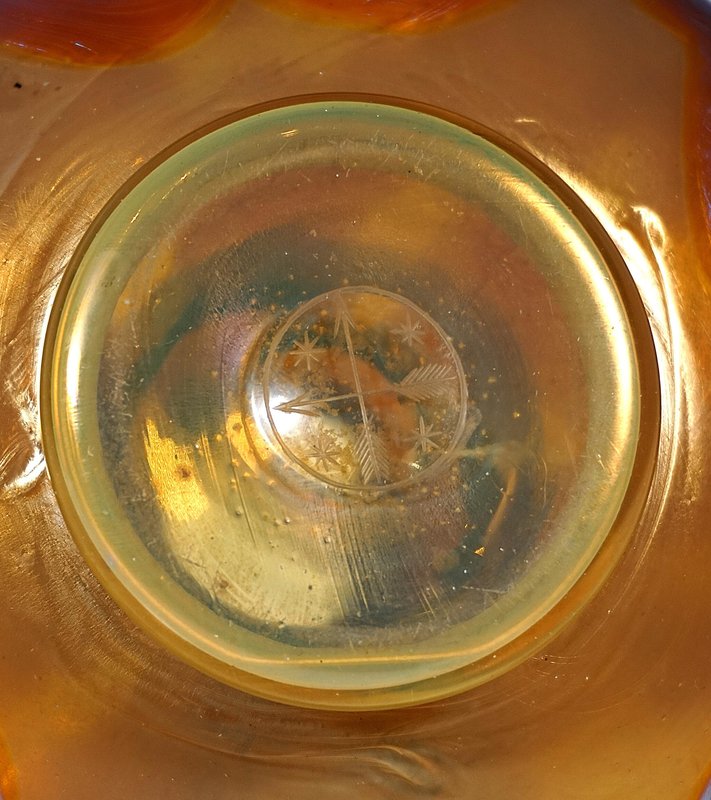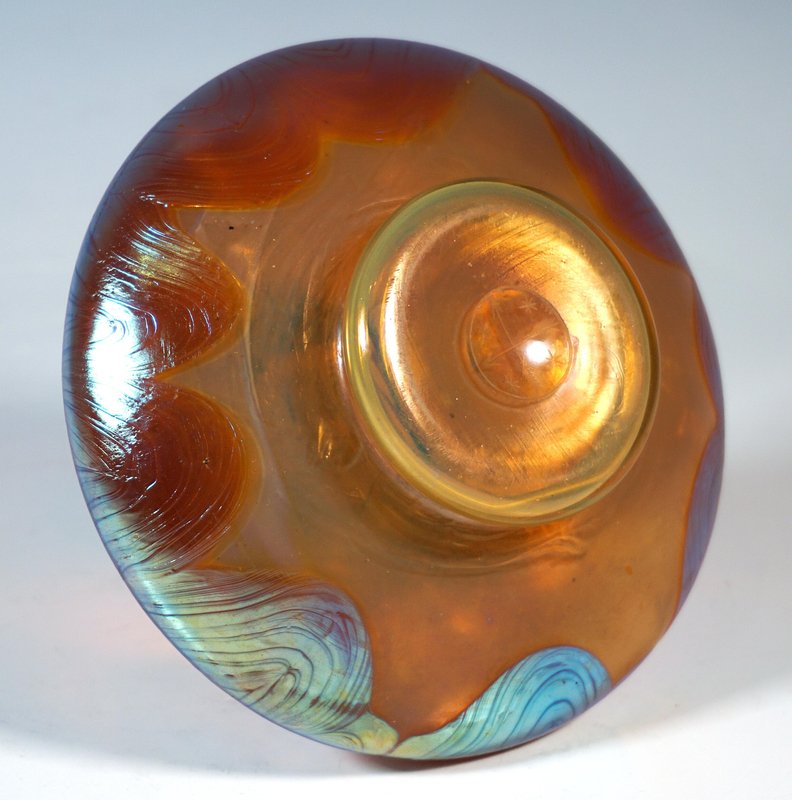 Corps de forme balustre, soufflé au moule, avec une large panse en forme de toupie, col attaché, sphérique avec bord évasé, base décalée, affleurant le sol, pontil poli, marque de signature en forme de flèche taillée dans la masse (- le symbole tiré des armoiries de Spaun a été déposé en 1891 comme marque de fabrique pour les verres de Klostermühle ; il a été utilisé comme signature sur les verres à partir d'environ 1898). Forme : Série II, Prod. PN 178, année 1900 (ancien : 8065, année 1899) Décor : Bronze Phenomeneon Genre - PG 29 Verre incolore, couche de couleur bronze, enveloppée de bandes bleues veinées de jaune d'argent et déformée irrégulièrement, laissant apparaître des fenêtres de couleur bronze. Modèle soufflé et façonné, réduit et irisé, en jaune argent bleuté sur la paroi extérieure, intérieur de l'ouverture buccale en jaune argent. Fabriqué par Loetz Widow / Klostermühle / Bohemia / Austria-Hungary Date de fabrication : vers 1900 Dimensions : Hauteur : 12,3 cm / 4.84 in Diamètre : 13,5 cm / 5.31 in