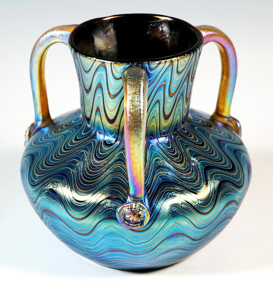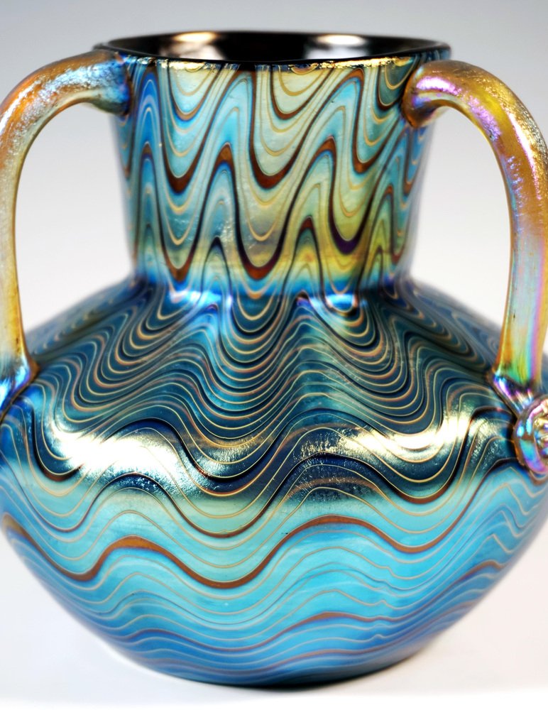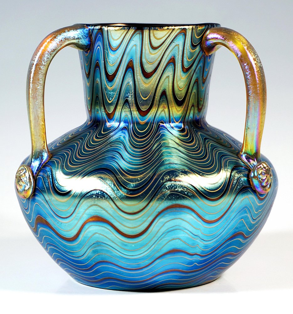 Vase en verre Art nouveau de Bohême : Soufflé à la bouche, corps bulbeux avec un large col en forme d'entonnoir, trois anses appliquées sous le bord et attachées aux épaules avec des rosettes estampillées, sur un pied affleurant avec un pontil poli, signature au sol "Loetz Austria". Forme : Série II, Prod. nr. - PN 340 (ancien : 346/350), année 1900 Décor : Phénomène Genre - PG Rubis 6893 Sous-couche en verre rubis, couche supérieure incolore recouverte sur une grande surface de fils blanc laiteux à jaune argenté veinés régulièrement et étroitement entrelacés, déformés en un motif nervuré en 12 parties pour former un décor de vagues, réduit et irisé d'or et de bleu, anses en verre jaune, irisé d'or et violet-bleu, avec rosettes estampillées sur les raccords inférieurs.