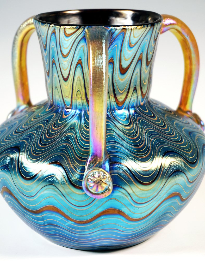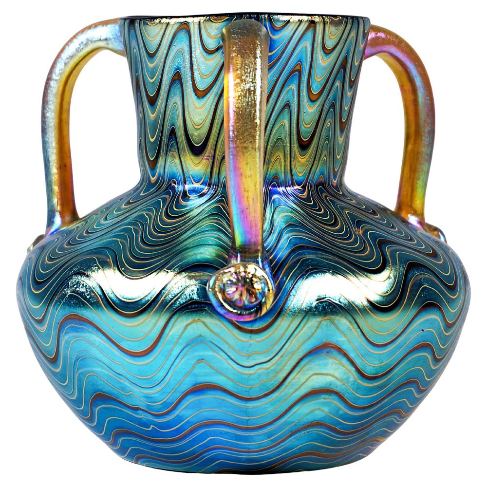 Finest Bohemian Art Nouveau Glass Vase: Mould-blown, bulbous body with a wide, funnel-shaped neck, three handles applied below the rim and attached to the shoulders with stamped rosettes, on a flush stand with a polished pontil, ground signature 'Loetz Austria'. Shape: Series II, Prod. nr. - PN 340 (old: 346/350), year 1900 Decor: Phenomenon Genre - PG Ruby 6893 Ruby glass underlay, colorless top layer covered over a large area with milky-white to yellow veined silver-yellow threads regularly and closely interwoven, warped in a 12-part ribbed pattern to form a wave decoration, reduced and iridescent gold and blue, handles made of yellow glass, iridescent gold and violet-blue, with stamped rosettes on the lower connections.
