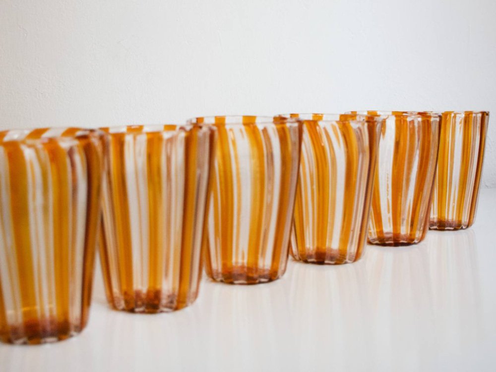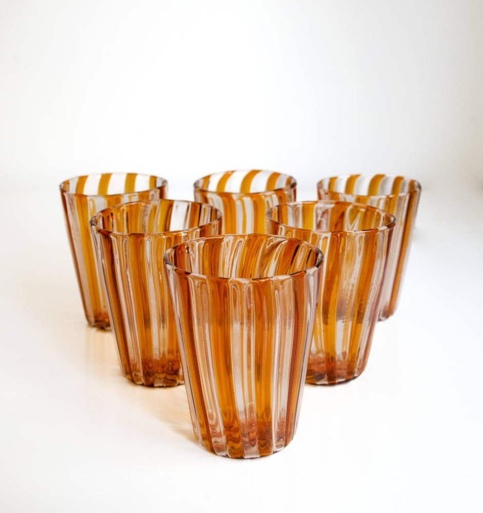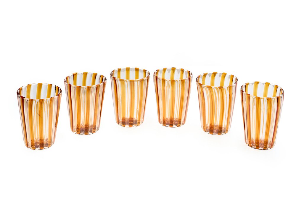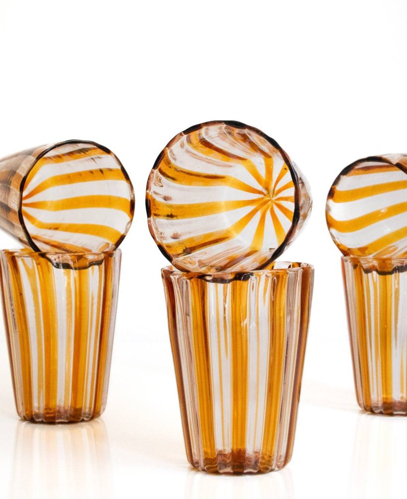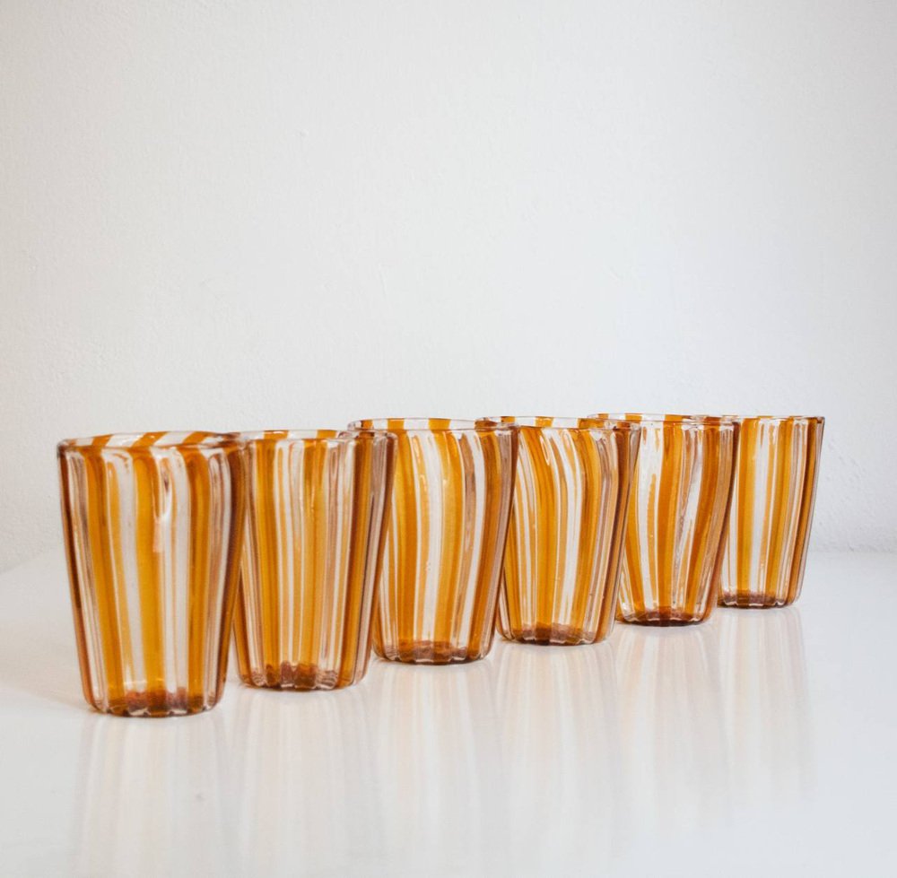 A stunning drinking set in colored Murano canes made by Angelo Ballarin for Ribes Studio. Gio Ponti glasses are made of canes, arranged perfectly thanks to the skill of Maestro Angelo Ballarin. Our glasses all look alike but each piece is not the same as another, means they are unique pieces.These glasses were made in the style of Gio Ponti for Venini in the 1948.