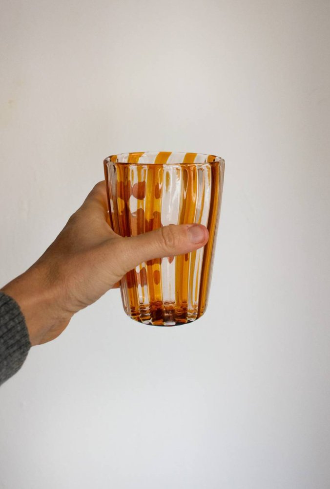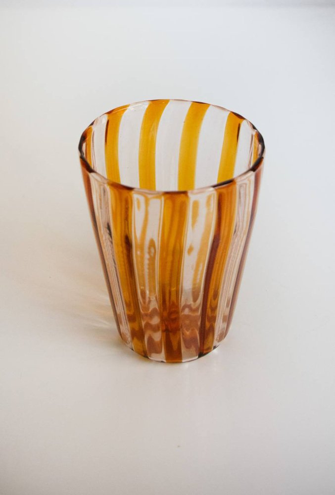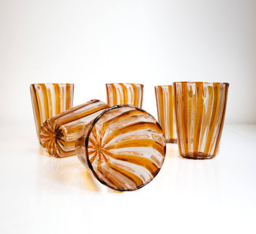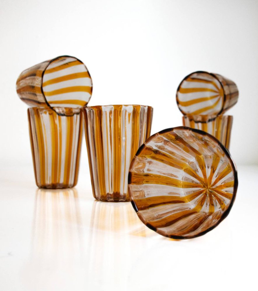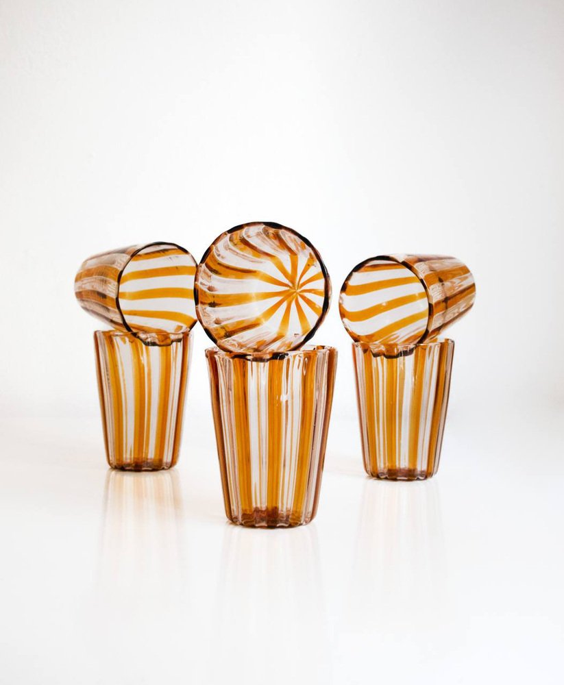 A stunning drinking set in colored Murano canes made by Angelo Ballarin for Ribes Studio. Gio Ponti glasses are made of canes, arranged perfectly thanks to the skill of Maestro Angelo Ballarin. Our glasses all look alike but each piece is not the same as another, means they are unique pieces.These glasses were made in the style of Gio Ponti for Venini in the 1948.