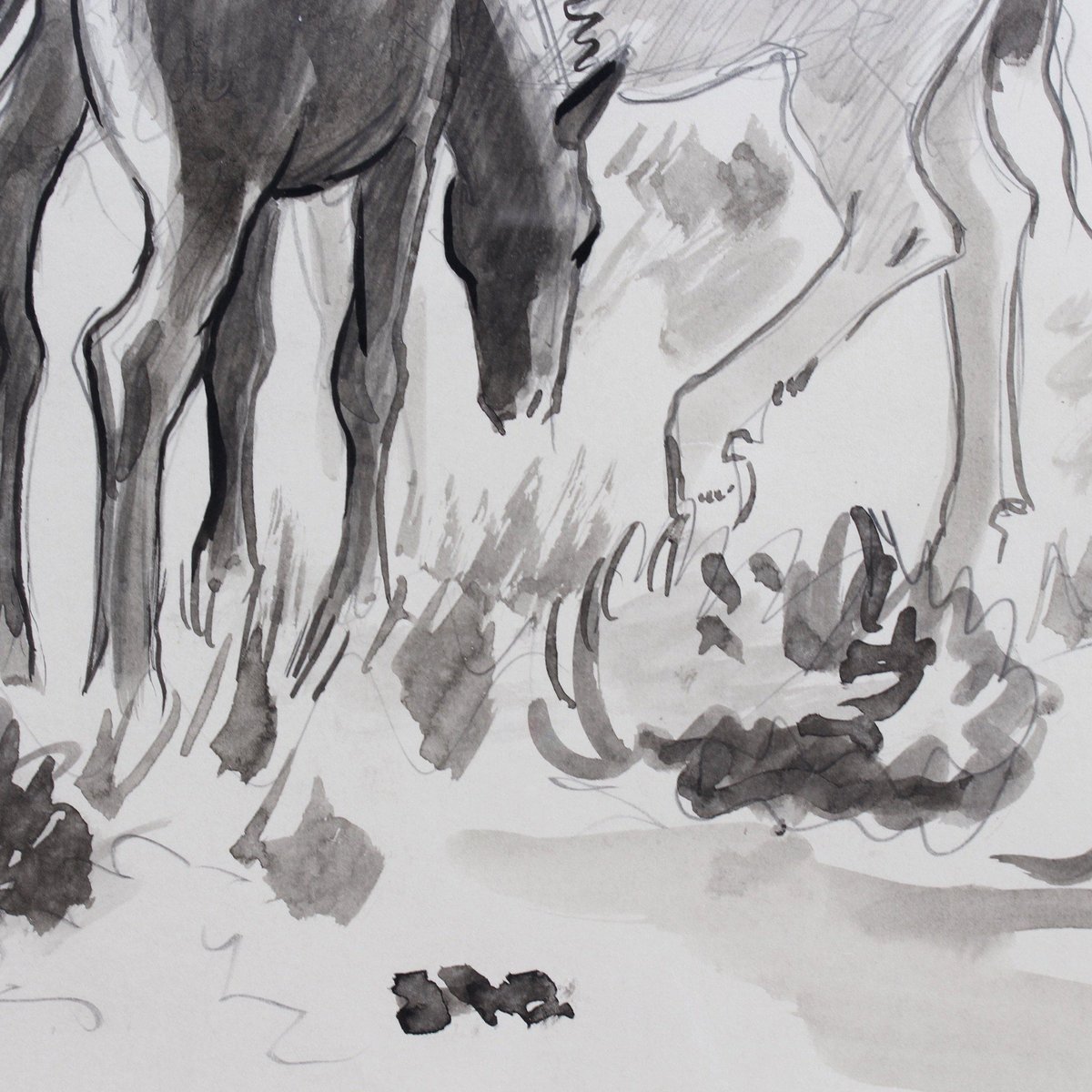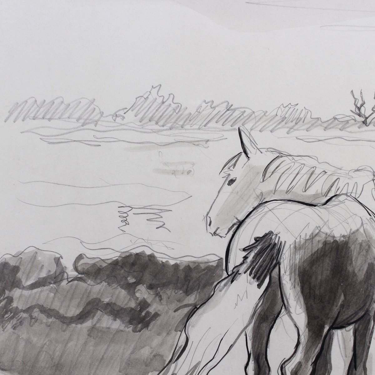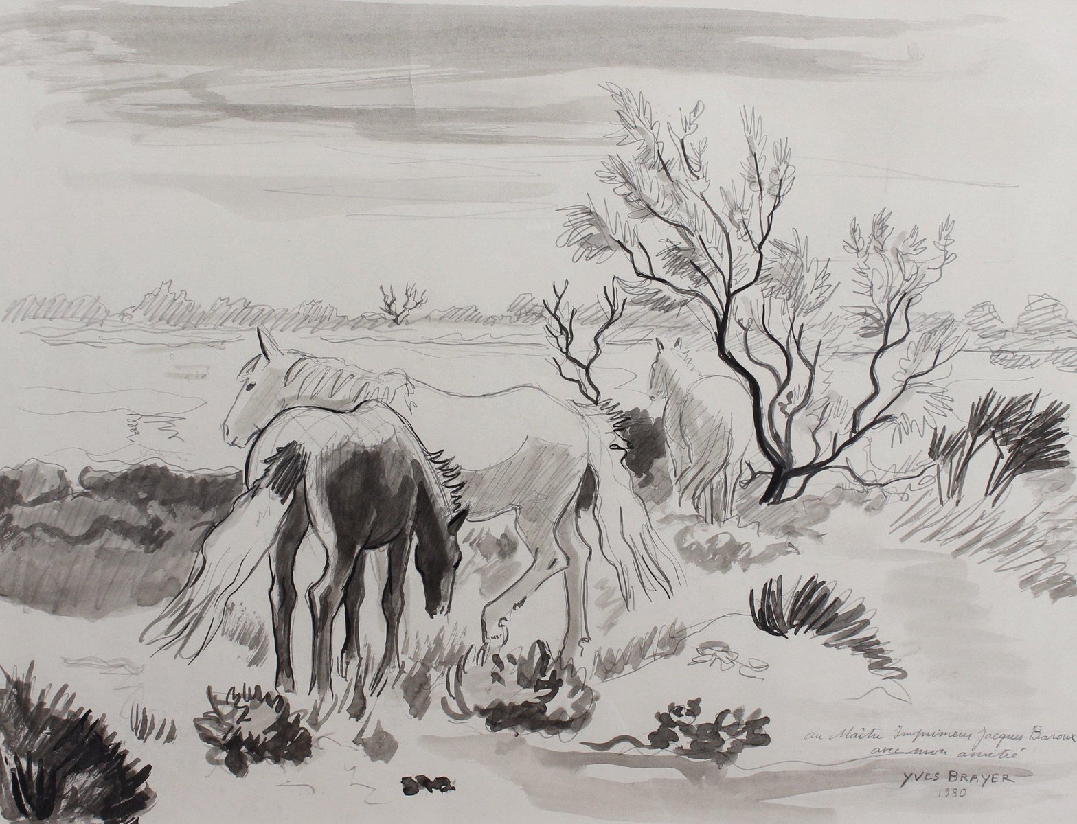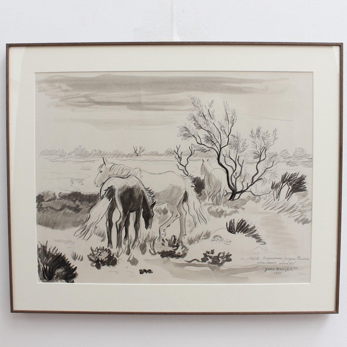 Horses at the Edge of the Pond', pencil, ink and watercolour on art paper, by Yves Brayer (1980). Brayer loved the Camargue region of France and painted it widely. The Camargue is a vast, swampy delta near Arles, very exotic, with tall marsh grasses where pink flamingos, black bulls and white horses roam freely. This image depicts three horses in the Camargue near pond's edge. Although there are many horses that still run free in the area, there are cowboys — called gardians — who ride the white horses on the beaches and herd black cattle, while flamingos wade in the shallow marshy waters. Dating back to the early 16th century, the gardians are a professional order of cowboys who protect and care for the herds of horses and black bulls that roam around the region. They're one of the oldest groups of cowboys in the world and the ancestors of the first American cowboys. Back in the 1600s, these gardians sailed to New Orleans, where they rode through the bayous of Louisiana and Texas, rounding up the cattle. This original artwork is signed by Brayer with a personal note for whom he created the piece. It says in French, ''to the Master Printer Jacques Barroux with my friendship. 1980'' This was most likely to thank him for a collaboration on a lithograph project. It is in good condition and is newly framed and glazed. There is a small crease in the upper centre-left section of the artwork in the clouds. It does not affect the overall impression of the painting. Please enjoy the many photos accompanying this listing. Upon request a video of the artwork may be provided. About the Artist : Yves Brayer (1907 - 1990) was born in Versailles, France. Determined to be an artist from an early age, he set out for Paris in 1924, initially studying at the academies in Montparnasse, and from there he attended the École des Beaux-Arts. Whilst still a student he exhibited at the Salon d’Automne and the Salon des Indépendants, and in 1927 Brayer left Paris for Spain with the aid of a state grant to enable him to study the works of the Spanish Masters in the Prado. On his return to Paris in 1934 he exhibited a collection of paintings inspired by his travels in Europe and Morocco to great acclaim. Having moved south to Cordes in the Tarn region of France after the War, Brayer then discovered the area which was to have the greatest artistic influence on his work: Provence. He was enchanted by the diverse and architectural forms of the Alpilles mountains, and by the vast expanse of the Camargue region with its ubiquitous white horses and black bulls. From then on he spent several months each year working in Provence. He also made several trips to Mexico, Egypt, Iran, Greece, Russia, USA and Japan where he was quick to grasp the unique rhythm and light of each country. A large collection of Yves Brayer’s paintings are on permanent display both at the Museum of Modern and Contemporary Art in Cordes, in the Salle Yves Brayer and at the Musée Yves Brayer in Les Baux de Provence, as well as various museums in France and elsewhere. Yves Brayer died in 1990. Dimensions with frame : H 52.5 cm / 20.7'' W 64.5 cm / 25.4'' Dimensions without frame : H 40.5 cm / 15.9'' W 53.5 cm / 21.1''